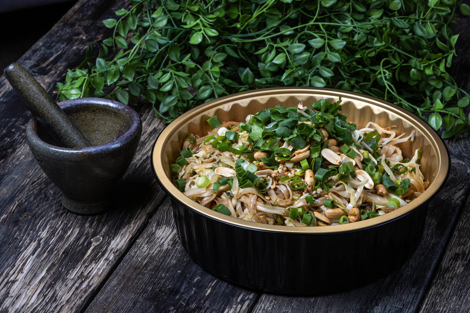 כמות של נודלס מוקפץ בקארי ירוק תרד ורוקט עם ירקות